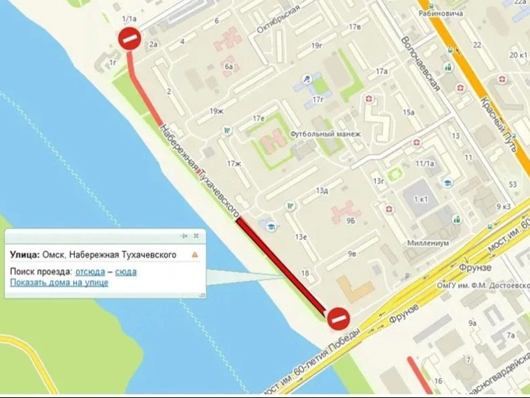 По информации администрации города Омска, в скором времени планируется длительное перекрытие участка набережной Тухачевского.