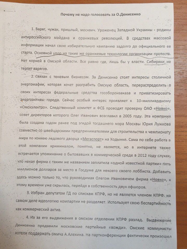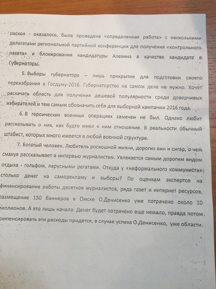 На портале «Омскинформ», который связывают с известным бизнесменом Моревым и якобы спонсируемым им Денисенко, появилась информация о неких планах штаба Назарова. Якобы пожелавший остаться неизвестным чиновник облправительства передал журналистам бумаги с набросками тезисов, на которых строится предвыборная кампания – почему стоит голосовать за Назарова и не голосовать за Денисенко.