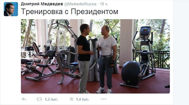 Вчера, 30 августа, президент России Владимир Путин и премьер-министр страны Дмитрий Медведев, находясь в Сочи, устроили небольшую показательную тренировку для прессы – первые лица государства позанимались на тренажерах, а затем позавтракали вместе в резиденции «Бочаров Ручей» в Сочи, передает РИА «Новости».