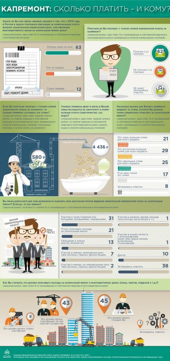 «В целом же большинство граждан, владеющих жилплощадью, полагают, что государство должно взять на себя часть расходов собственников по оплате капитального ремонта в многоквартирных домах или же покрывать эту сумму полностью за счет средств госбюджета», - сообщается в официальном релизе ВЦИОМ.