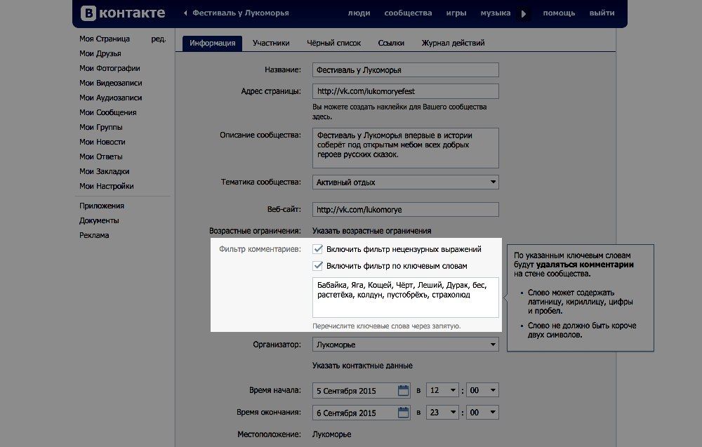 Фильтры для автоматического удаления нежелательных комментариев можно подключить в меню «Управление сообществом» — «Информация». Руководителям групп теперь доступна настройка фильтрацию нецензурных выражений на основе словаря, составленного при участии профессиональных филологов и лингвистов. Нецензурная лексика распознается на четырех языках — русском, английском, украинском и казахском. Кроме того, разработчики внедрили фильтр, благодаря которому можно ввести свои ключевые слова, запрещенные к использованию в комментариях.