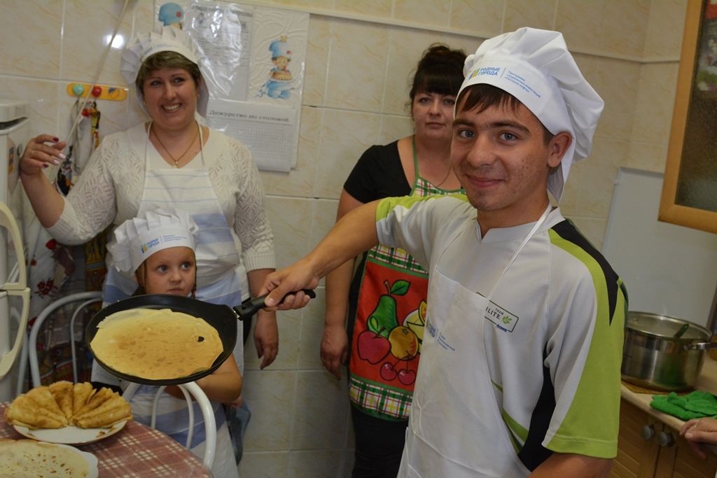 Детей ждала насыщенная программа по домоводству, основным пунктом которой стал мастер-класс по приготовлению абрикосового и сливового варенья. Кроме того, ребята научились сами печь блины, их затем вместе попробовали на чаепитии, специально к которому волонтеры привезли еще и большой торт.