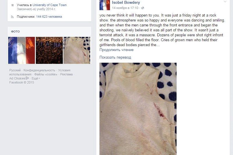 Изобель Бодери оказалась среди выживших. Ради спасения ей пришлось целый час притворяться мертвой. На следующий день девушка опубликовала на своей странице в Facebook обращение ко всем, кто помог ей пережить случившееся, и ко всем, кто погиб. К письму Изобель приложила фото окровавленной блузки, которая была на ней в тот вечер. Записью уже поделились более полумиллиона человек.