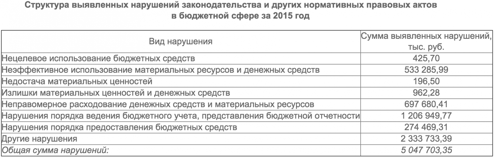 Как выяснилось, из этой суммы более 5 млрд освоены с нарушением бюджетного законодательства. В частности, 425 тыс. рублей бюджетных средств использованы неэффективно. Кроме того, чиновники в 2015 году неэффективно использовали материальные ресурсы и денежные средства на сумму 533 млн рублей.