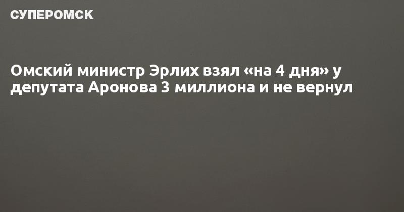 Сегодня в Первомайском райсуде Омска прошло заседание по иску депутата Омского городского Совета Евгения Аронова к Виталию Эрлиху. Будучи региональным министром сельского хозяйства и продовольствия, Эрлих взял у Аронова в долг 3 миллиона рублей. Договор займа был заключен 8 июня прошлого года. Предполагалось, что деньги должны будут возвращены 12 июня.