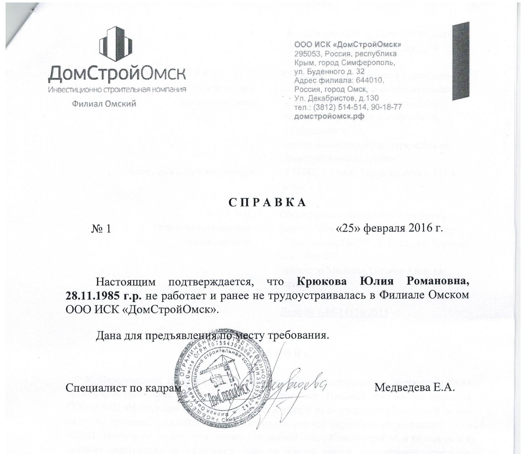 В ходе процесса сложилась запутанная ситуация с бывшим представителем ДСО Юлией Крюковой. «Интервью» попросило предоставить ей статус свидетеля по делу, поскольку Крюкова со стороны ДСО принимала работу от маркетингового центра и вела документооборот. Однако до сей поры суд не разрешил ходатайство, и Крюкова вынуждена впустую ходить на каждое судебное заседание, каждый раз отпрашиваясь с работы. Между тем ДСО поспешил откреститься от своего бывшего представителя, направив справку о том, что Крюкова никогда не состояла в штате «ДомСтройОмска», и официально заявил, что якобы ОМЦ «Интервью» подделал документы, представленные суду.