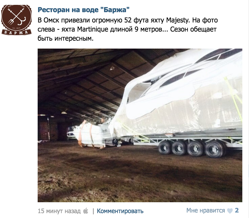 В разгар кризиса в Омск привезли люксовую 52-футовую морскую яхту марки Majesty. Верфь этого бренда находится в Объединенных Арабских Эмиратах. О завозе морского судна, которому, видимо, предстоит бороздить воды Иртыша, сообщается в группе «Ресторан на воде «Баржа».