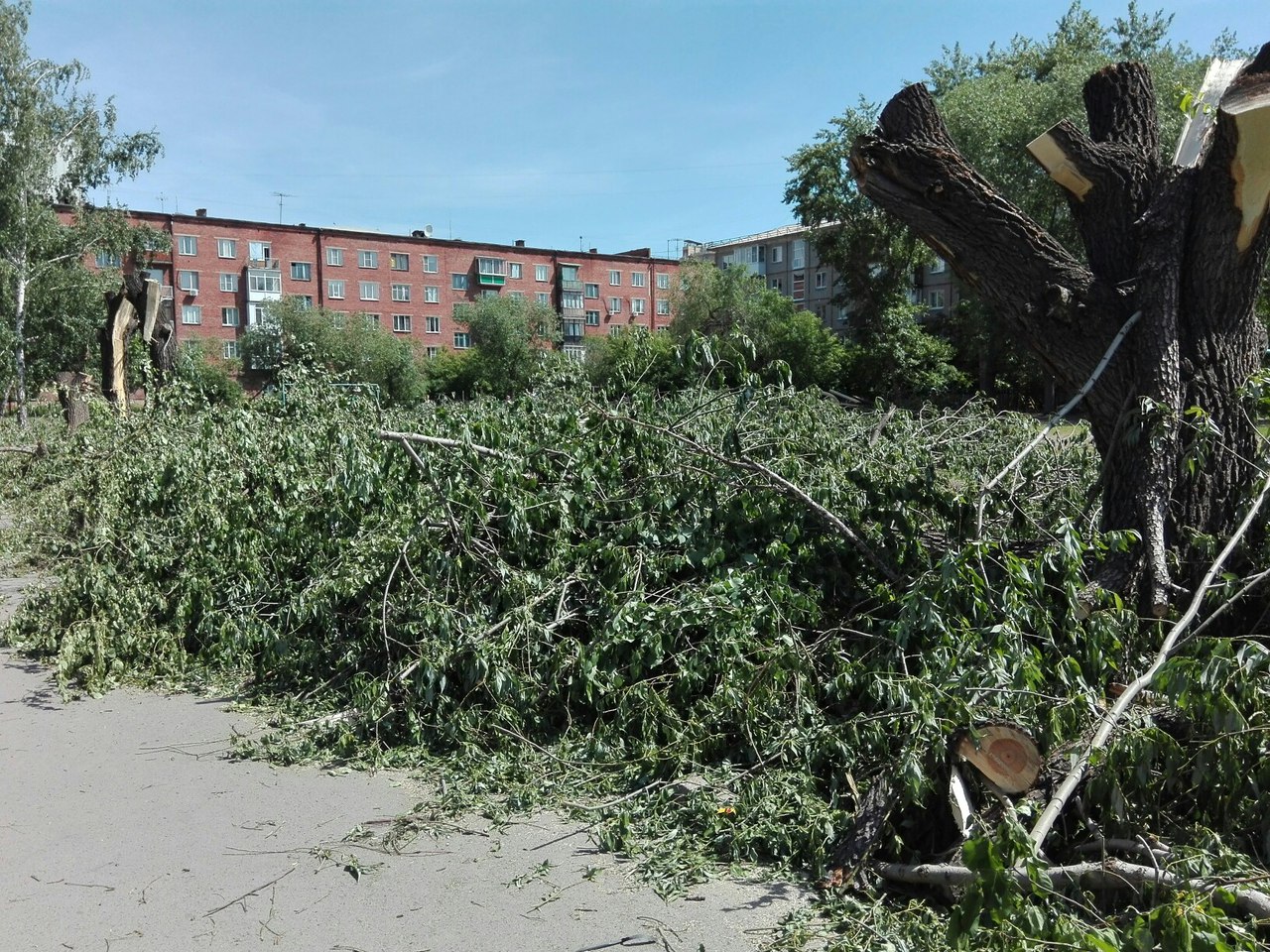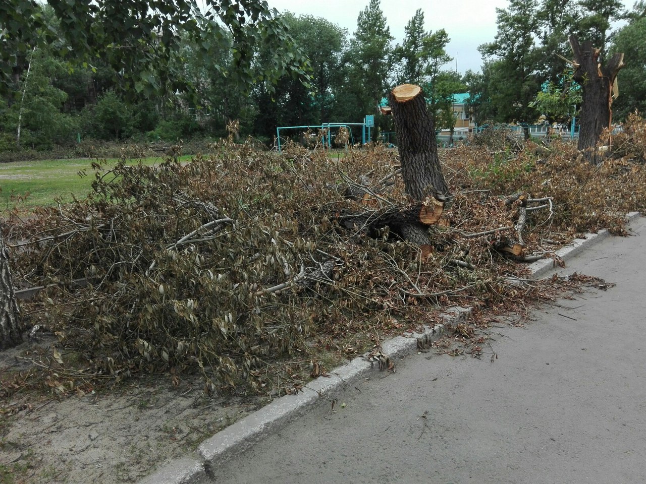 Уже на протяжении двух недель пешеходы, проходящие мимо школы № 37 по ул. Валиханова, и жители прилегающих домов наблюдают апокалиптичную картину. Вокруг стадиона, принадлежащего учебному заведению, в начале июня кронировали и спиливали деревья, и уже на протяжении двух недель спортивная площадками завалена обрубками. Когда их планируют вывозить и намереваются ли вообще – пока остается тайной.