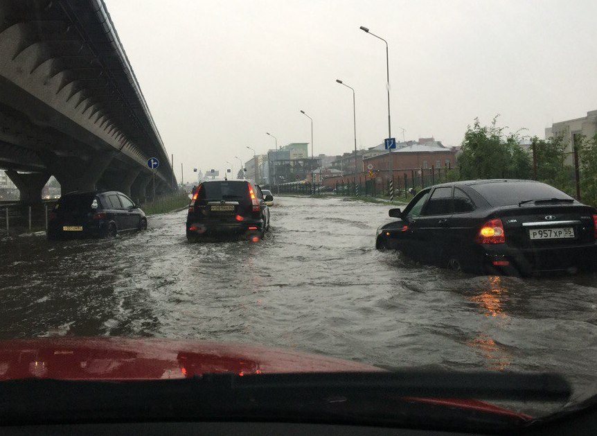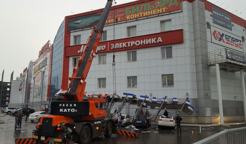 В субботу, 23 июля, на Омск обрушился сильный ливень. Соцсети заполонили множество сообщений о последствиях дождя и ветра. Так, у ТЦ «Континент» вывеска кинотеатра придавила несколько авто. Для ее поднятия был предоставлен кран.