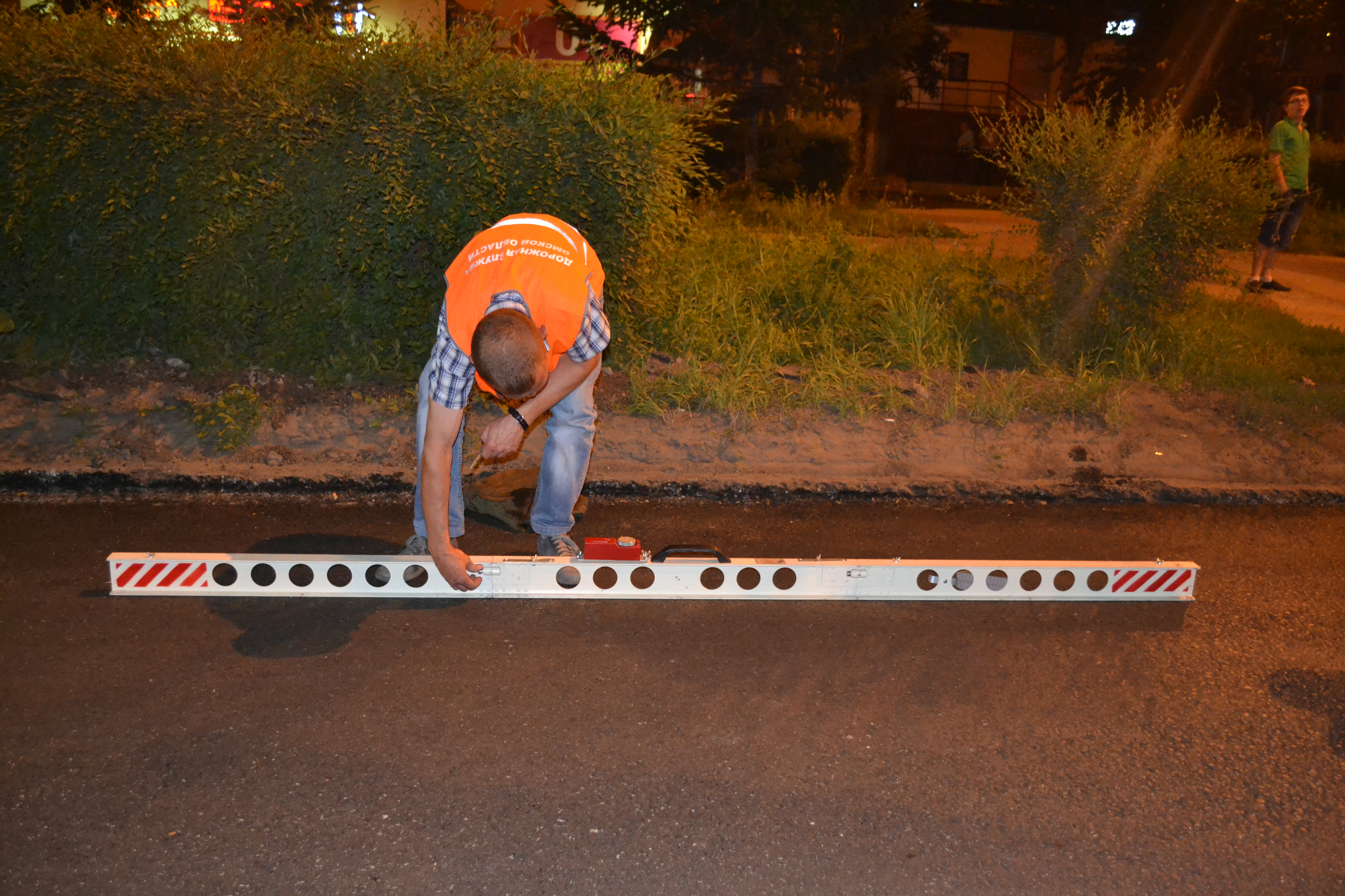 На соответствие ГОСТу его проверили специальной трехметровой рейкой, которая с точностью до миллиметра измеряет просветы и уклоны проезжей части, а также ровность дороги с точностью до одного миллиметра. Этот участок дорожного полотна проспекта Мира испытание не прошел, поэтому подрядчик (ред. - ООО «Стройсервис») получит предписание.