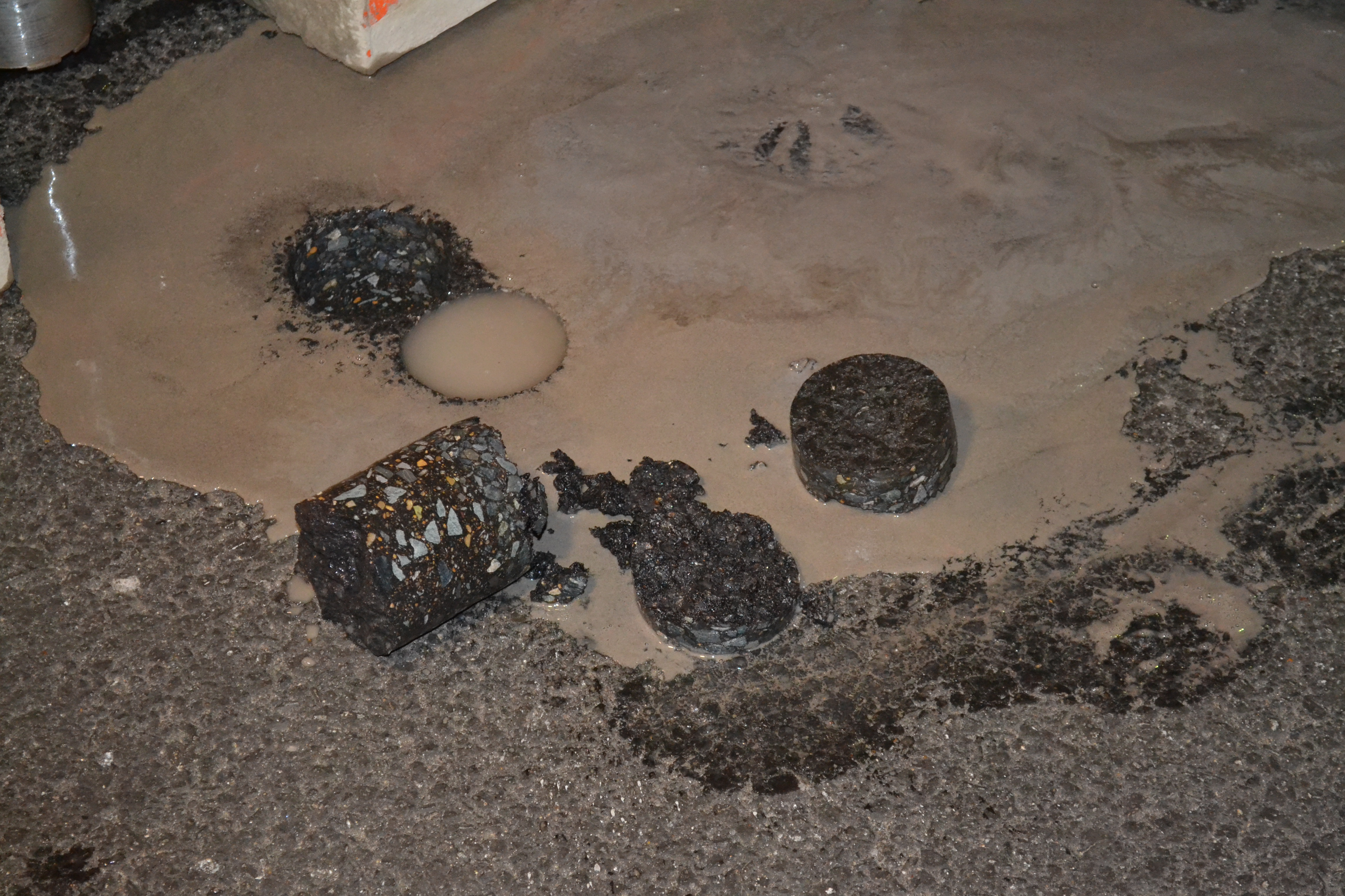 Первый объект контроля - отбор кернов (проб асфальтобетона) выравнивающего слоя.
