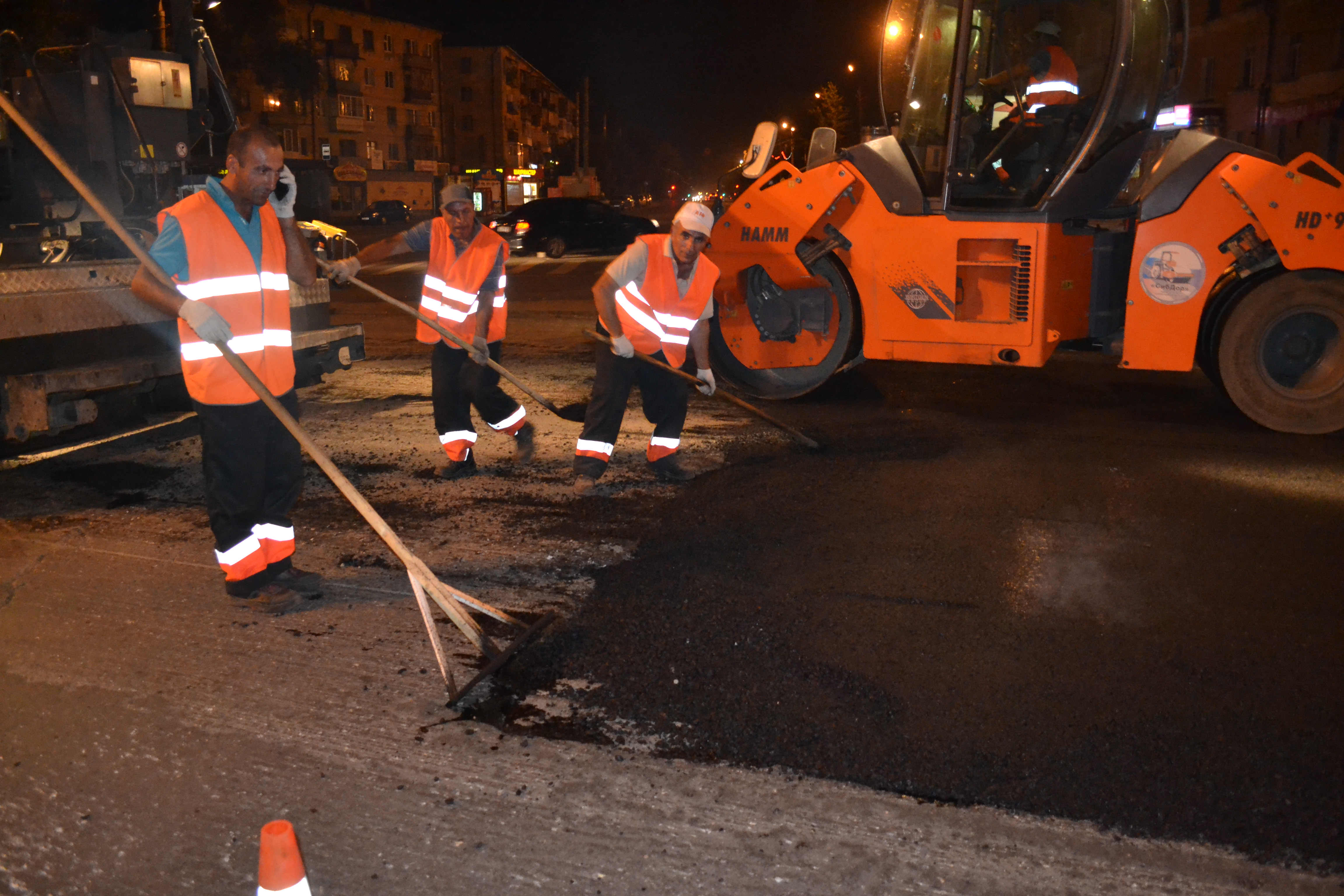 От асфальта шел пар. Работало много людей и разной современной техники.