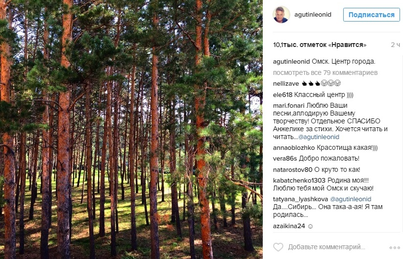 Сегодня известный российский певец поделился селфи с супругой Анжеликой Варум подписав снимок «Омское утро». На втором снимке Агутин запечатлел сосновый бор и подписал: «Омск. Центр города».