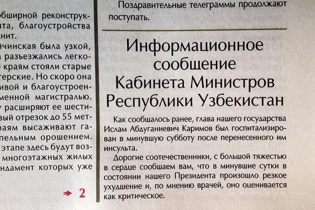 Накануне в местной прессе было опубликовано официальное заявление Кабмина Узбекистана о том, что после перенесенного инсульта состояние Каримова резко ухудшилось и, по мнению врачей, оценивается как критическое.