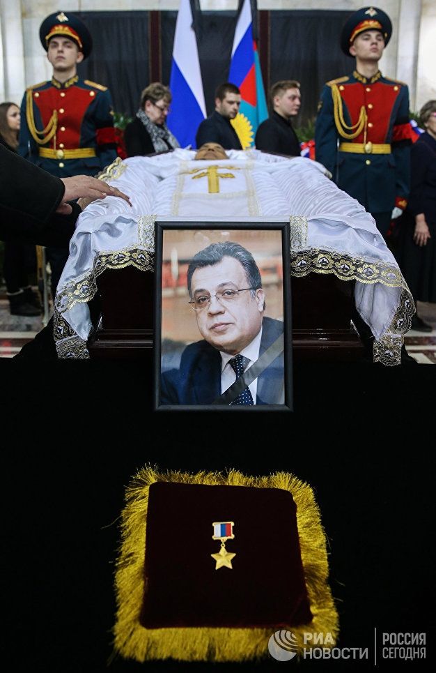 Сегодня, 22 декабря, в Москве прошла церемония прощания с 62-летним послом РФ в Турции Андреем Карловым, которого убили в понедельник, 19 декабря. Панихида состоялась в главном корпусе МИД РФ, куда прибыли родственники и близкие погибшего, а также высокопоставленные лица – министр иностранных дел Сергей Лавров, премьер-министр Дмитрий Медведев и президент Владимир Путин. Глава государства возложил цветы к гробу и выразил соболезнования семье убитого – матери, вдове и сыну.