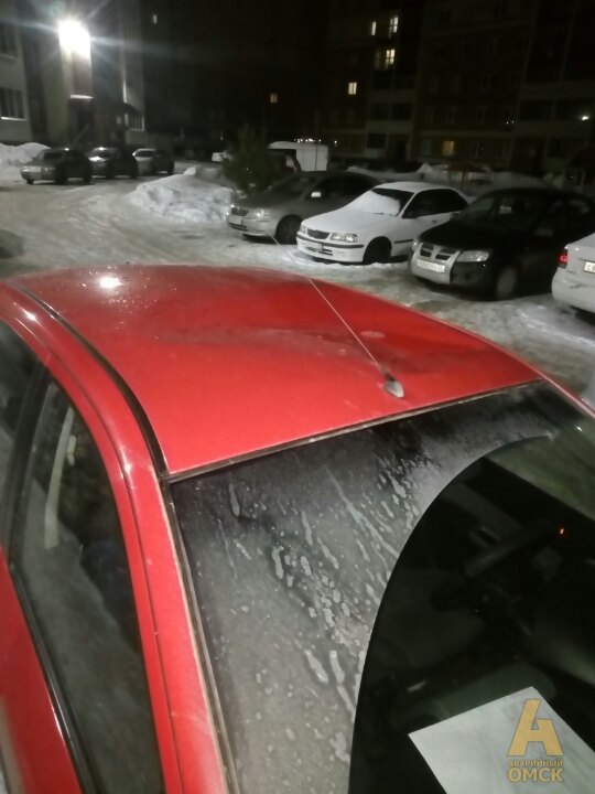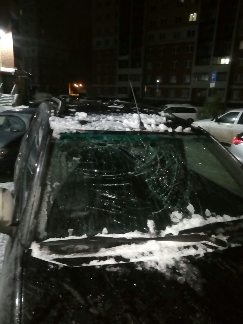 На внедорожник Mitsubishi упала глыба льда. У автомобиля разбито стекло. При этом, как сообщают очевидцы, хозяин машины даже не вышел на улицу, а только отключил сигнализацию.