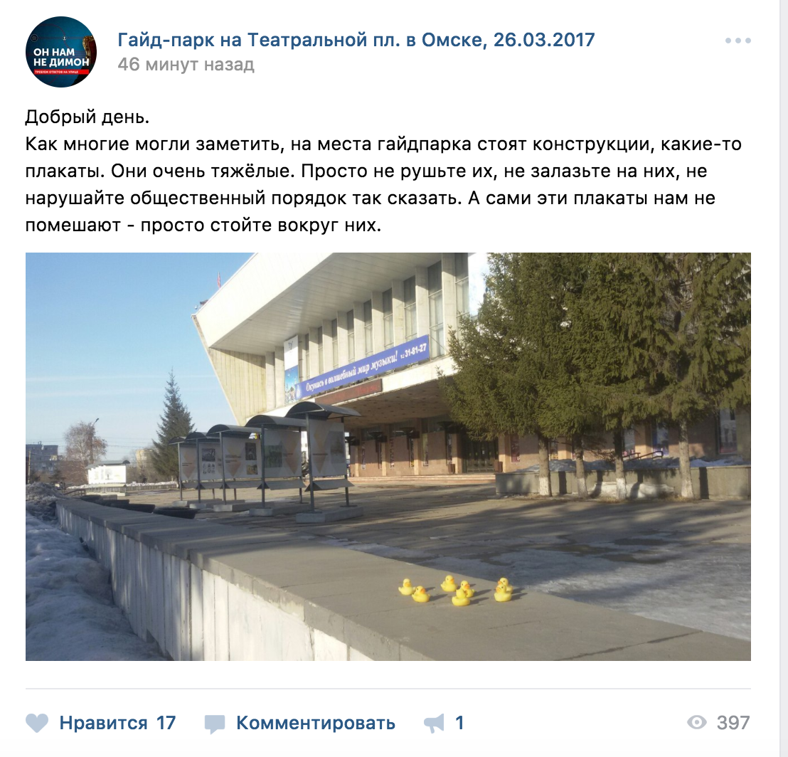 «Как многие могли заметить, на месте гайд-парка стоят конструкции, какие-то плакаты. Они очень тяжёлые. Просто не рушьте их, не залазьте на них, не нарушайте общественный порядок, так сказать. А сами эти плакаты нам не помешают - просто стойте вокруг них», - говорится в сообщении в группе мероприятия соцсети «ВКонтакте».