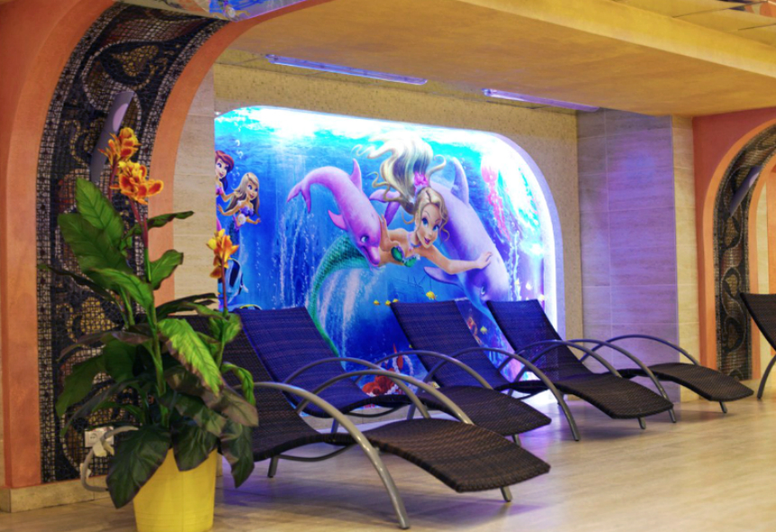 8. Большая детская зона с бассейном глубиной всего 50 сантиметров и шикарная детская комната в аквапарке позволяют организовать вместе с аниматорами безопасный и веселый досуг малышей не только в воде, но и в помещении. Мокрое кафе, мини-бар с прохладительными напитками, детские игровые поля и горки позволяют доставить максимальное удовольствие как детям, так и взрослым.