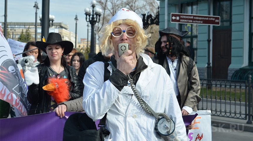 Сегодня, 1 мая, в Омске прошла ежегодная всероссийская акция «Монстрация», которая приобрела омский колорит, сменив в нашем городе название на «Омстрацию». Акция собрала порядка сотни человек в различных образах и костюмах, главной же среди всех себя чувствовала собака, следовавшая во главе колонны. В какой-то момент животное вовсе демонстративно легло перед колонной – чтобы шествие продолжилось, одной из участниц пришлось уносить собаку на руках.