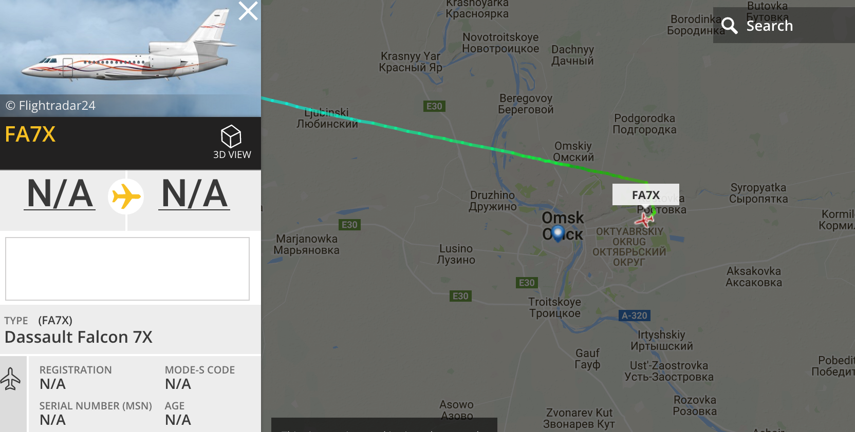 В среду, 17 мая, в 00:34 в аэропорту «Омск-Центральный» зашел на посадку бизнес-джет Falcon 7x, чья средняя цена колеблется в районе 50 млн долларов.