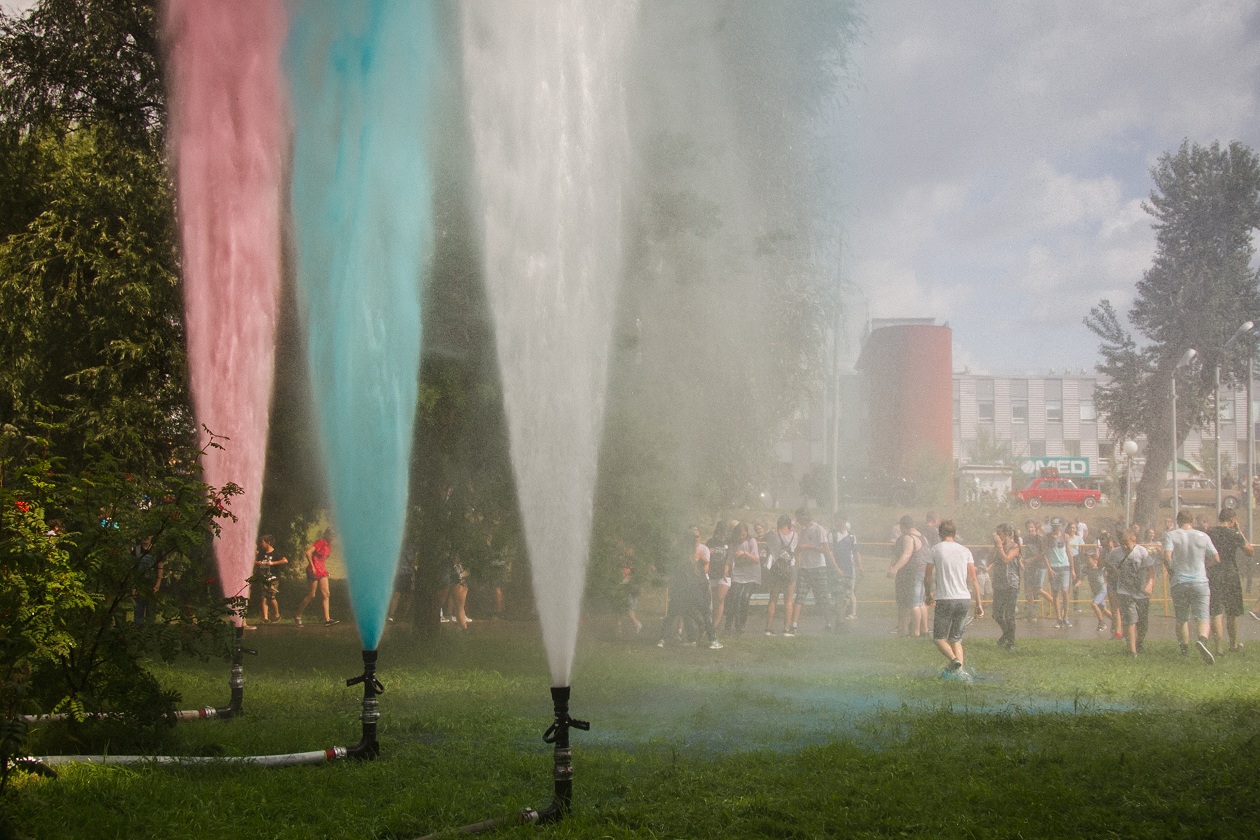 Салют из воды цвета триколора длился несколько минут – три цветных фонтана взмыли в небо из пожарных рукавов сразу после окончания Гимна России, создав вместе картину Государственного флага. Потоки из воды достигали в высоту нескольких метров. Публика встретила водный салют с восторгом, а благодаря жаркой погоде публика не боялась подойти ближе, чтобы лучше рассмотреть цветные потоки.