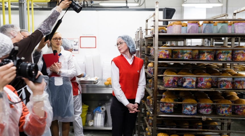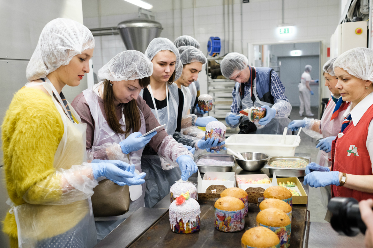 Так для журналистов и гостей здесь устроили мастер-класс по изготовлению куличей. Участникам экскурсии показали пекарню гипермаркета, попасть в которую можно лишь через служебный вход.
