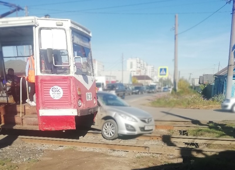 Судя по кадрам, на перекрестке трамвай зацепил серую «Мазду» и протащил ее несколько метров по рельсам.