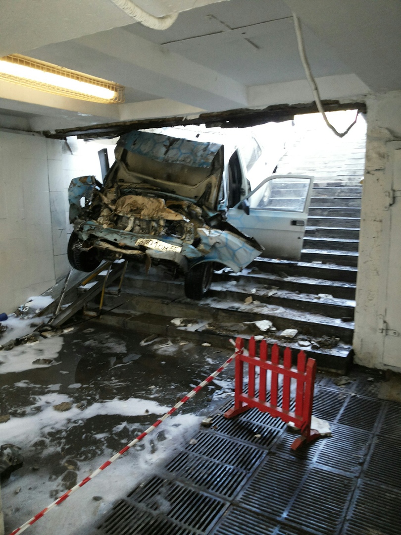На данный момент вход, куда припарковалась «Волга», перекрыт. Рабочие уже отмыли пол и стены от бензина, моторного масла и тосола. Восстановительные работы займут по меньшей мере два дня.