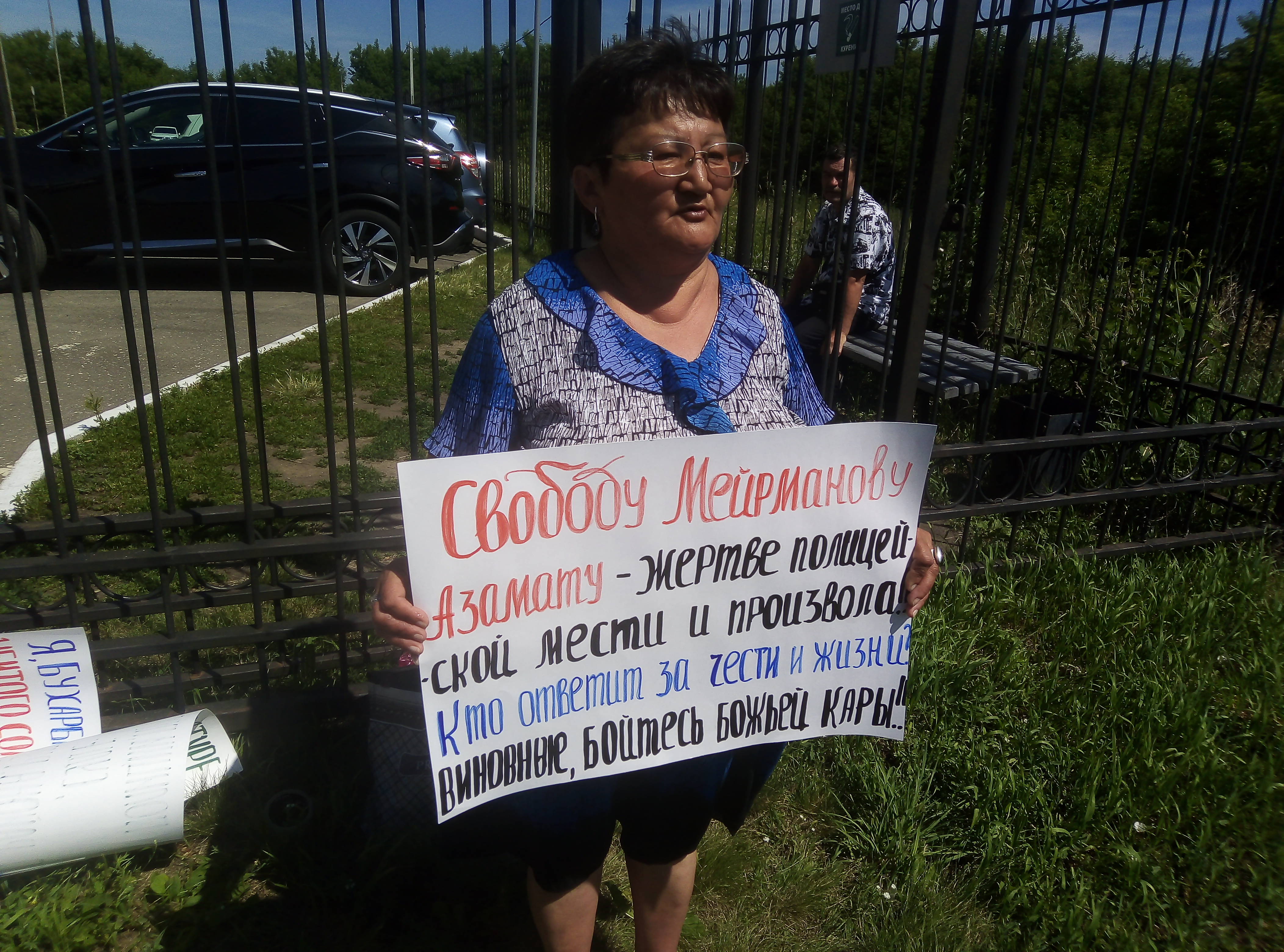 В четверг, 11 июля, за оградой Кировского районного и Омского областного суда можно было заметить женщину с плакатом в руках. Подходим. Узнаем известную омскую общественницу Алму Бухурбаеву. Выясняем подробности и узнаем, что этот одиночный пикет устроен в защиту Азамата Мейрманова - сына имама из села Южное Павлоградского района.