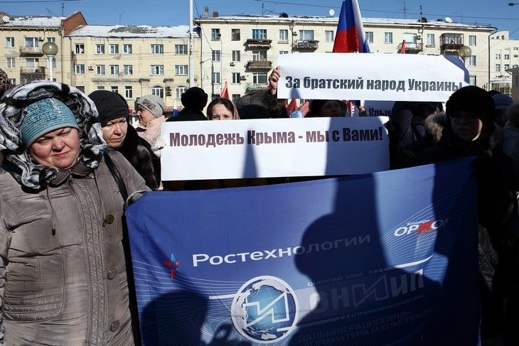 В Омске у библиотеки имени Пушкина прошел митинг в поддержку Крыма и русскоязычных жителей Украины, организованный омскими профсоюзами и региональным отделением ОНФ. Митингующие, которых, по оценкам полиции, собралось около 4 тысяч, приняли резолюцию о согласии на ввод российских войск на Украину. Другого мнения придерживалась только одна девушка, стоявшая с плакатом «Нет войне».