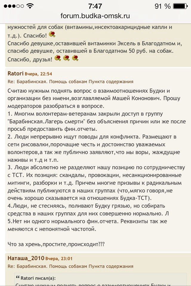 «Многим волонтерам-ветеранам закрыли доступ в группу «Барабинская.Лагерь смерти» без объяснения причин или же после просьб предоставить финотчеты… Люди абсолютно не разделяют нашу позицию по сотрудничеству с ТСТ. Их позиция: скандалы, провокации, несанкционированные митинги, разборки, и т. д. Причем многие призывы к радикальным действиям публикуются в наших группах... Люди, не стесняясь, поливают «Будку» грязью, но собирать средства в наших группах для них совершенно нормально», - пишет автор форума под ником Ratori.