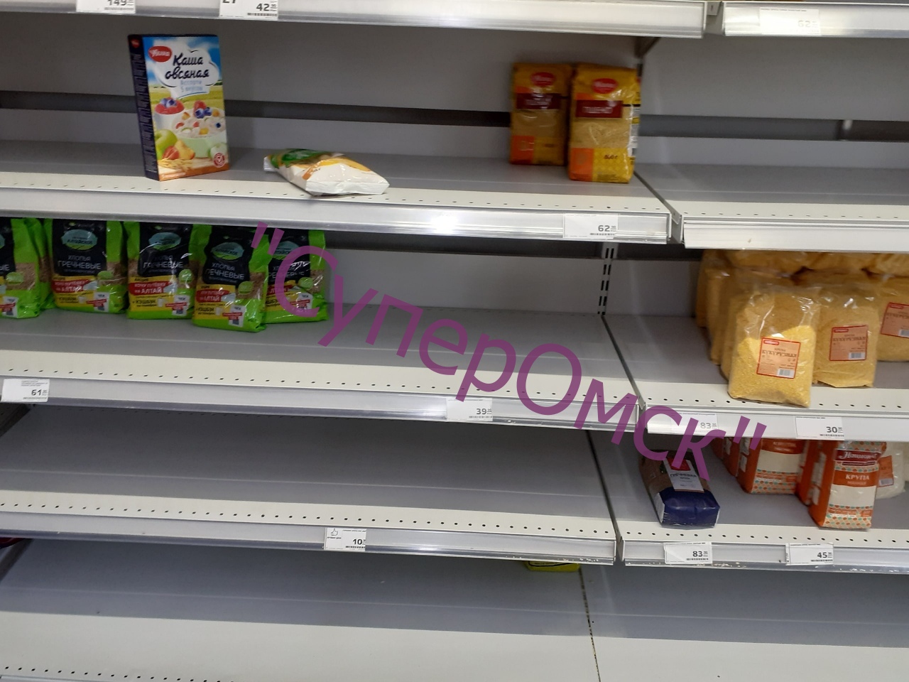 Так, в омских магазинах продолжают пустеть полки. В частности, в одной из торговых точек популярной сети уже к открытию наблюдалось запустение на полках с кашами и сахаром.