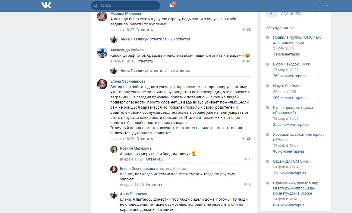 «Сегодня на работе одного увезли с подозрением на коронавирус... потому что голову свою не включил и руководство не предупредил, что вернулся с заграницы... а сегодня признаки болезни появились... сколько людей подверг опасности, просто слов нет... а ведь вирус убивает пожилых... если сам не боишься заразиться, то пожалей пожилых своих родителей и родителей своих сослуживцев...», – написала омичка в своем комментарии к посту, посвященному двухнедельному карантину для вернувшихся из-за границы.