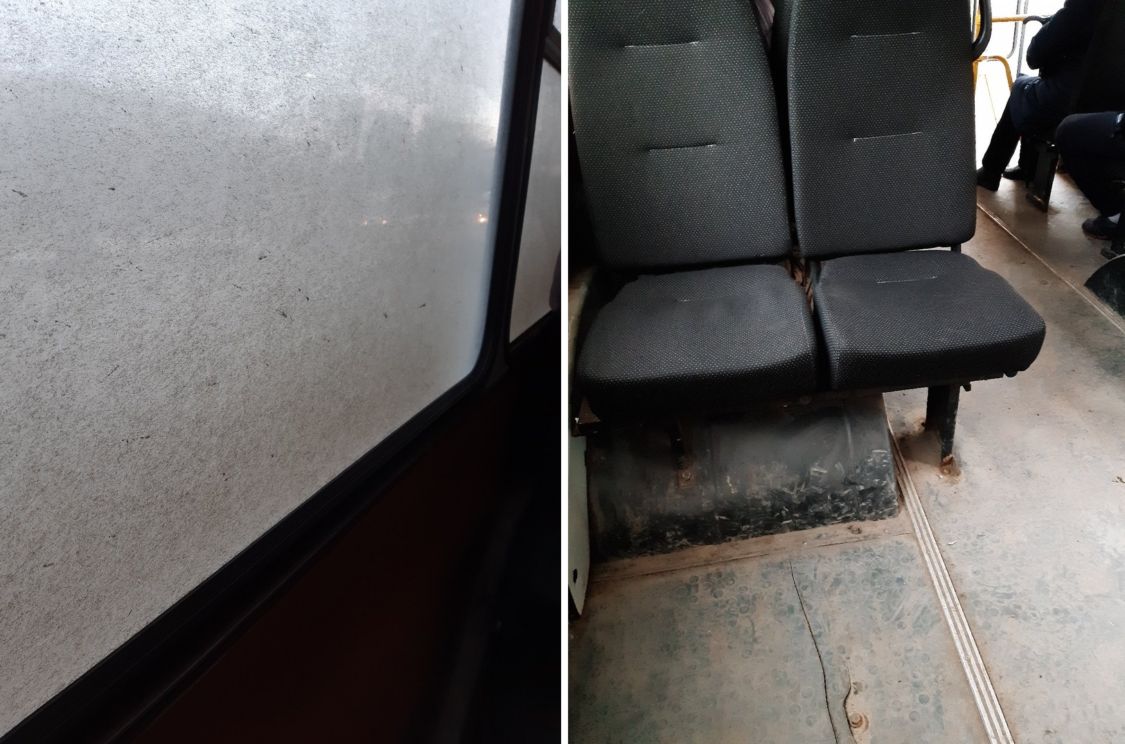 «394-я маршрутка, 8 утра... И что там говорили про дезинфекцию транспорта? Хоть бы грязь просто вымели! Дышать от пыли невозможно», – написала девушка в своем посте, приложив фотографии.