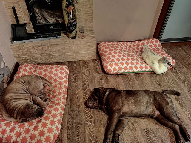 Фэст и Сэнди в тот долгий час почуяли неладное даже за закрытой дверью ванной и метались, пытаясь прийти на помощь Гаве – члену семьи, поделилась Анастасия. Когда же Гавы не стало, шарпеи уже это поняли. В ту ночь в доме стояла тишина – Сэнди в горьких чувствах спала рядом с пустой клеткой Гавы, а Фэст – на пороге комнаты, где жила утка, хотя обычно они ночуют рядом с хозяйкой. Особенно тоскливо псу – ведь птичка была его возлюбленной, его половинкой, и с именно с ней они были не разлей вода. Осиротевшим шарпеям помогают отвлечься лишь прогулки, да и то на время.
