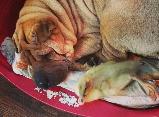 Омичка взяла утенка домой, не представляя, что делать с птицей, хотя бы потому, что дома ее ждали два шарпея – мать Сэнди и ее сын Фэст. В первые дни пес явно намеревался слопать новичка, приняв его за подвижное блюдо, однако на защиту птички встала его мать. Сэнди приняла утенка под свою защиту и охраняла до тех пор, пока Фэст не смирился с нахождением в своем доме пернатой.